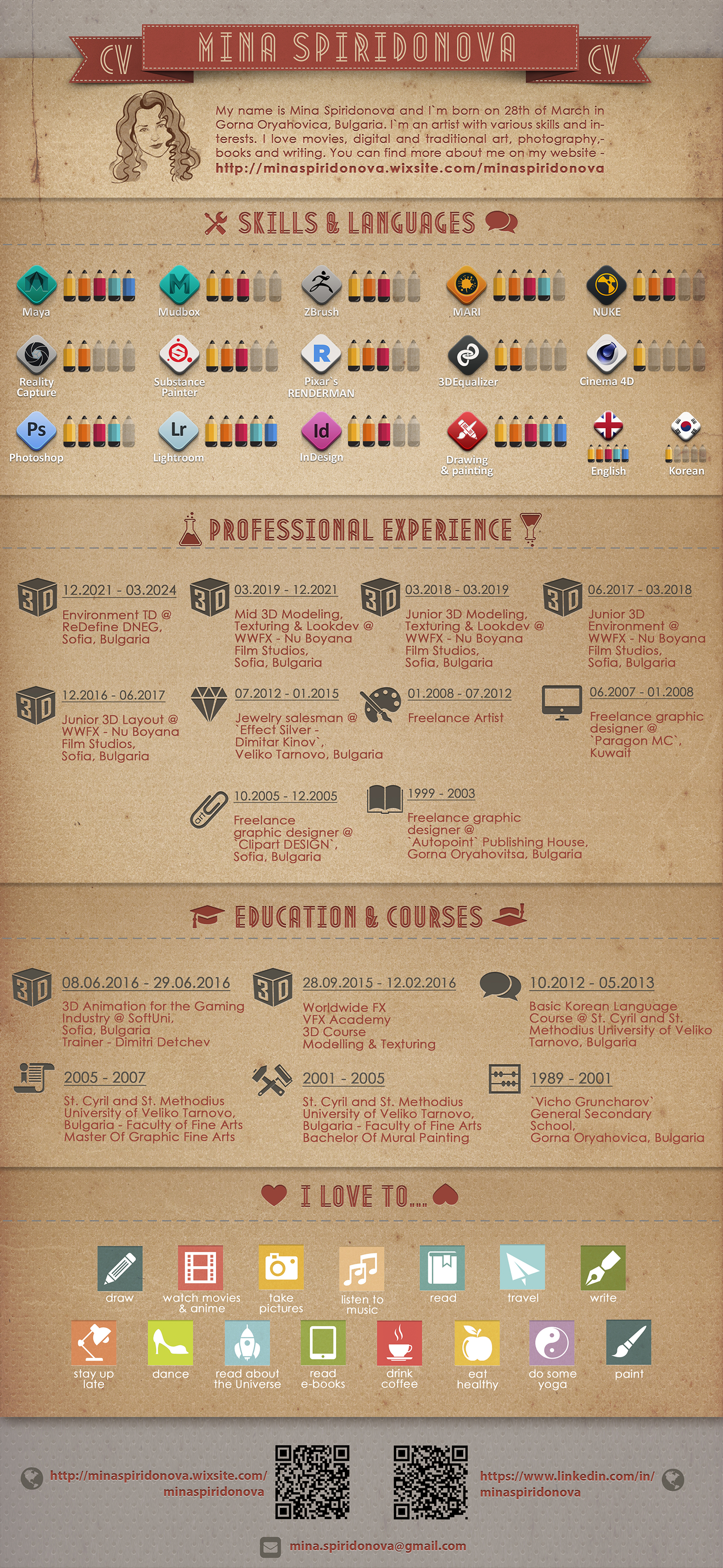 My name is Mina Spiridonova and I'm Bulgaria based artist with professional artistic education and excellent computer skills. Through the years I`ve been working as freelance graphic designer, freelance artist and silver jewelry salesman. Lately I've found a new passion as 3D VFX artist in the movie industry. I`m fascinated with all kinds of arts, writing, photography, movies and books. Feel free to contact me anytime.